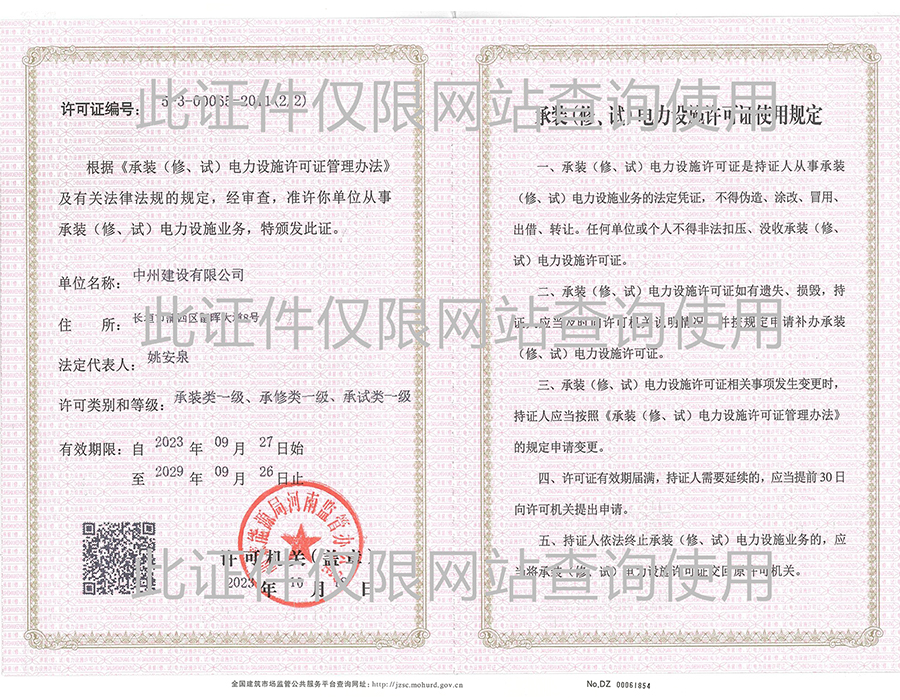 承裝(修、試)電力設(shè)施許可等級證書
