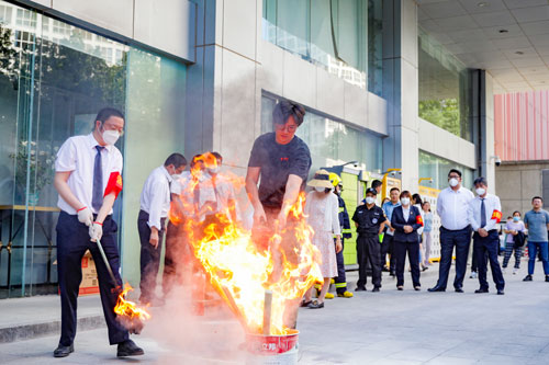 隨后,全體參加演練的人員在東側廣場集合,由物業(yè)安保部向大家進行滅火器材使用講解,演示如何使用自救呼吸器,并組織演練人員現(xiàn)場實操。演練和演示活動結束后,組織方相關人員進行了總結點評,為進一步提升應急處置能力提出了改進建議和措施。