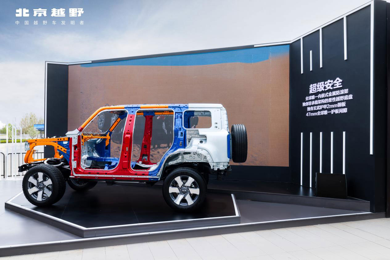 在超級安全方面,BJ40增程從結構安全和電池安全兩方面,全方位保障駕乘人員安全。內(nèi)嵌金屬防滾架,采用79.8%的熱成型鋼和高強鋼,抗壓力達130000N。獨家設計了包括玄武護甲、47mm護板間隙、柔性越野底盤在內(nèi)的三層外部防護系統(tǒng),使電池防御磕碰撞擊能力較同級提升將近一倍。BJ40增程搭載的電池抗極寒極熱、抗振、抗刮、抗扭、疏堵合一、防水等多項技能,是硬派SUV里面唯一實現(xiàn)六維電池安全認證的車型。